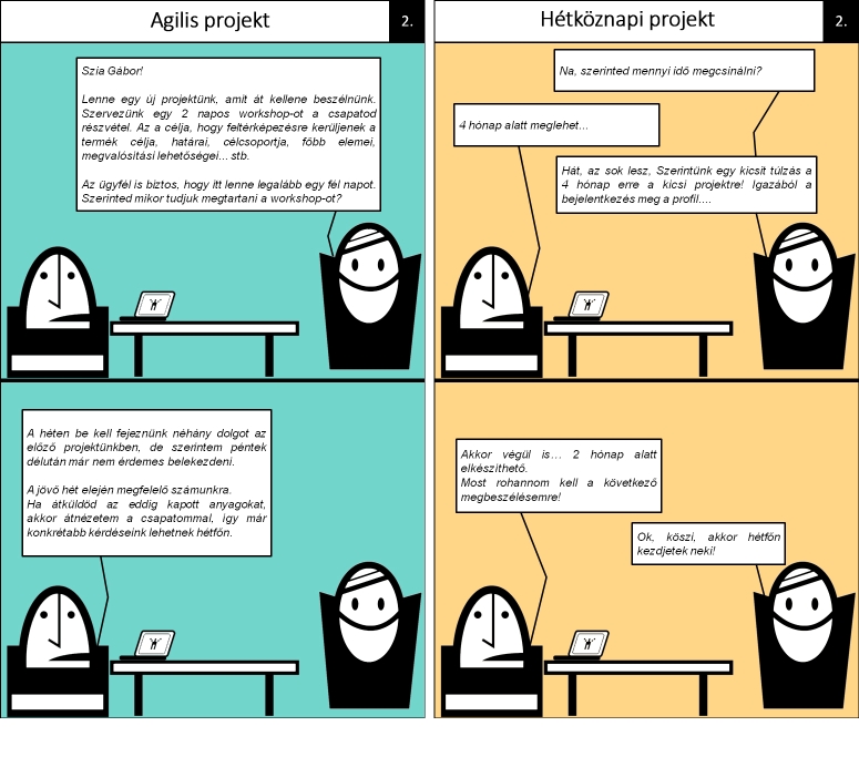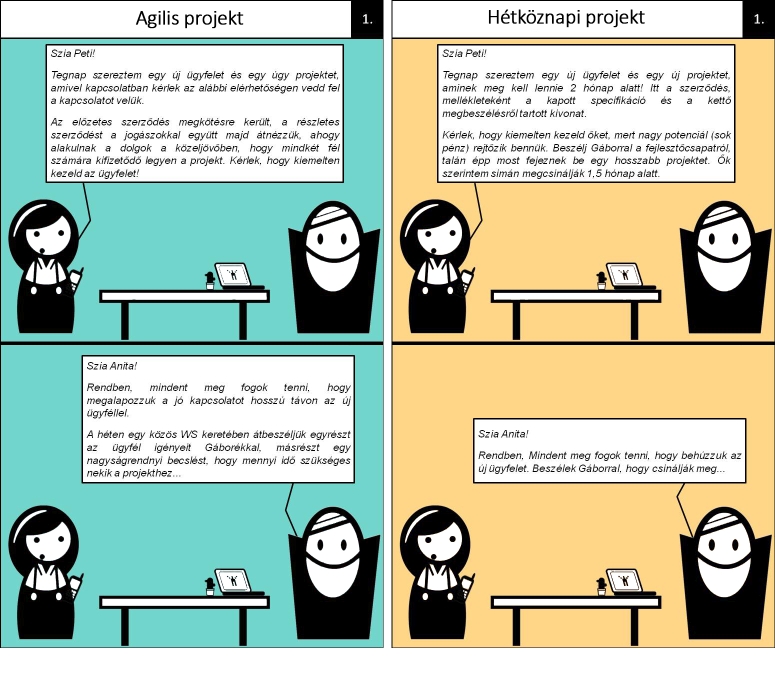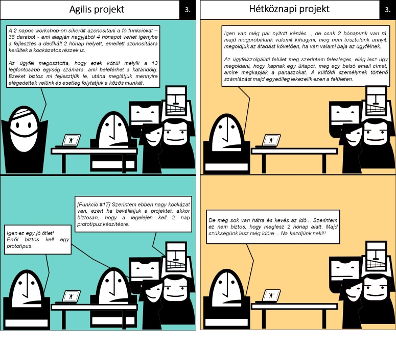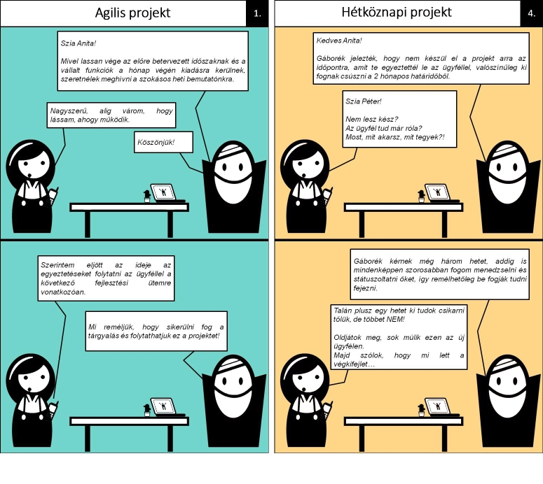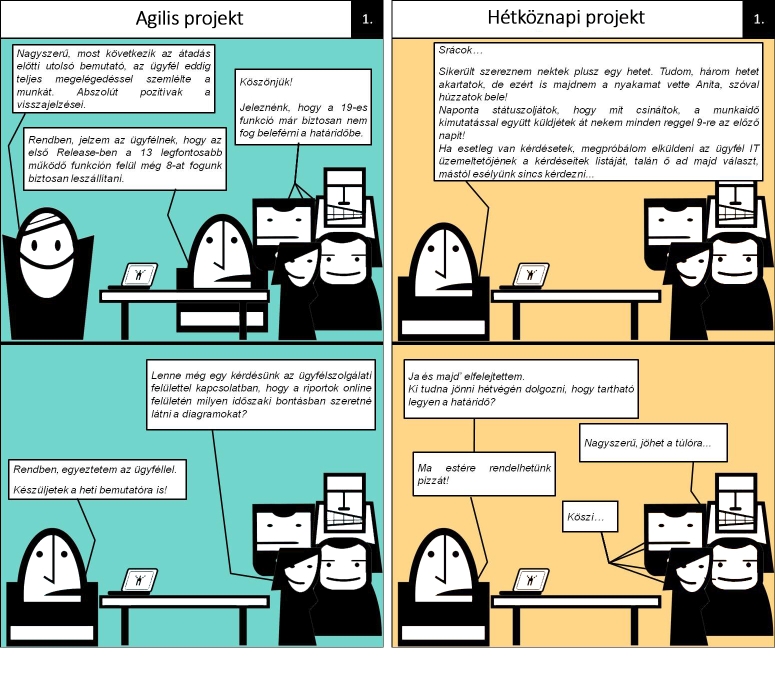 A rövid képregényben tanulmányozhatóak a különbségek a hétköznapi projektek és az agilis projektek között